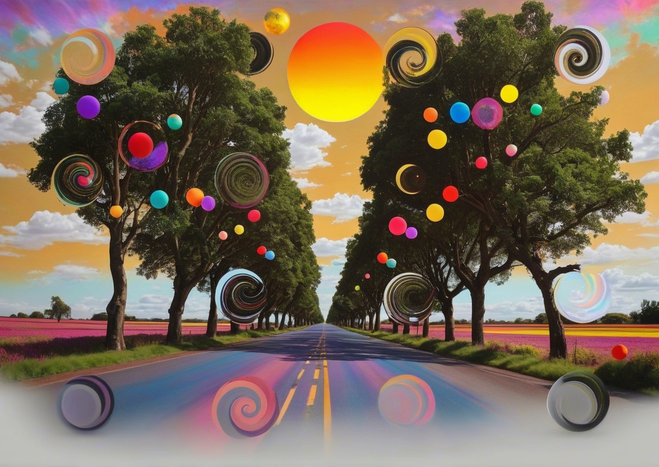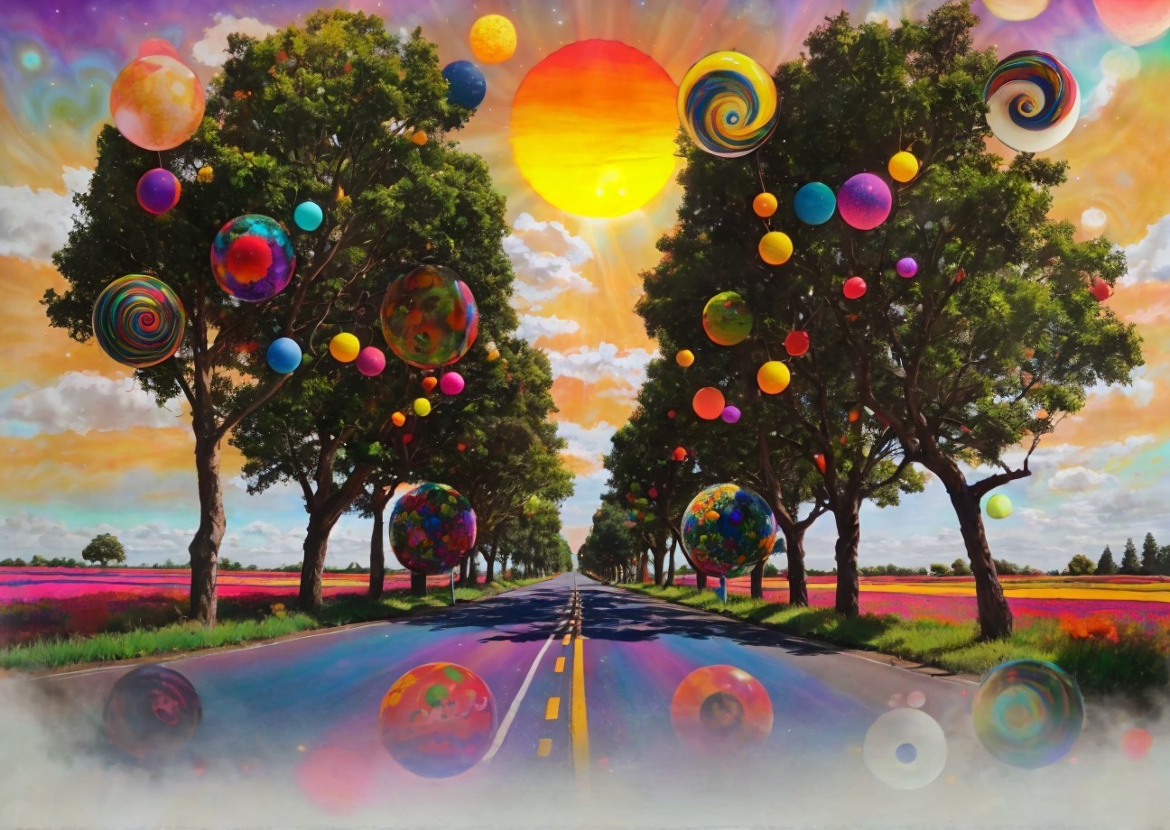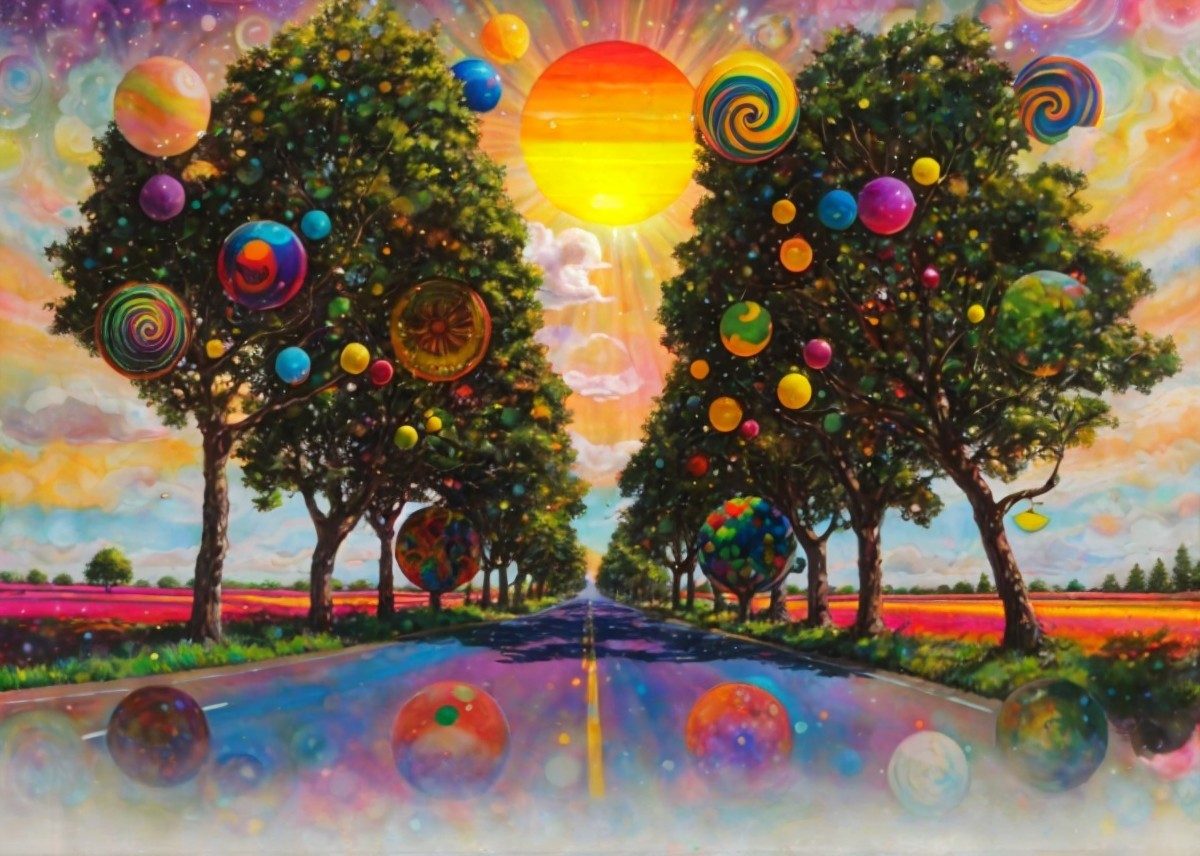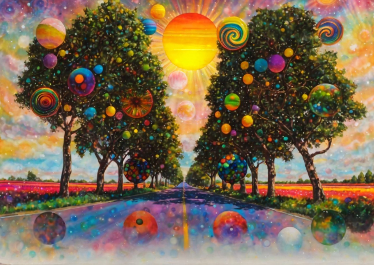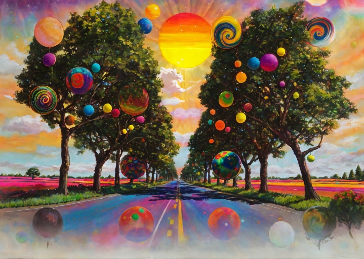 A vibrant, surreal landscape features a colorful road lined with trees, under a radiant sun. Floating orbs representing planets add a whimsical touch to the dreamy scene.