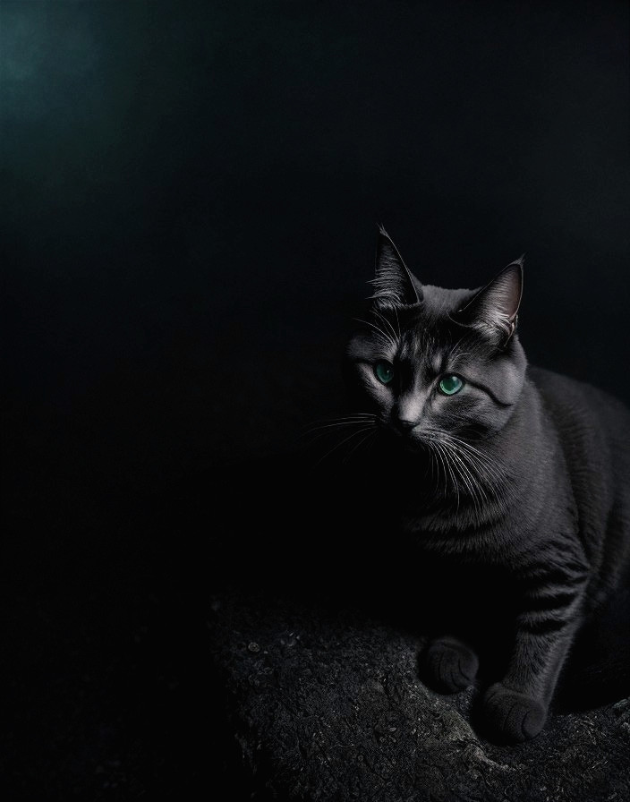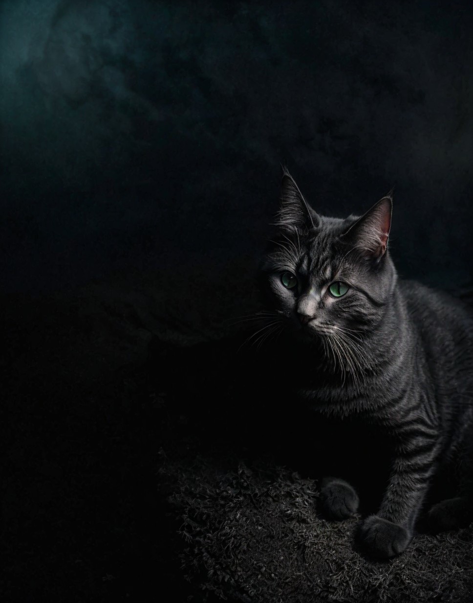 A striking gray tabby cat lounges in a dimly lit setting, its vibrant green eyes captivatingly focused. The soft shadows and misty background create a mysterious ambiance.