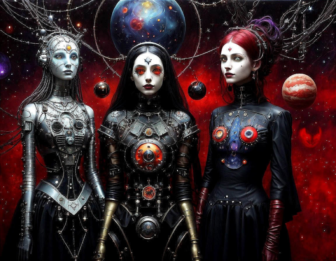 Prompt: natural beauty of cosmic witches, dresses filled with small metal and machine details, cyberpunk style, Fine art inspired by Paul Klee and Dave McKean, a mix of photorealistic and abstract art, cosmic sensuality and strings of stars, , stars, orbs, red fangs, steel leather, cybernetic clothes, wire mesh suits, interesting atmosphere