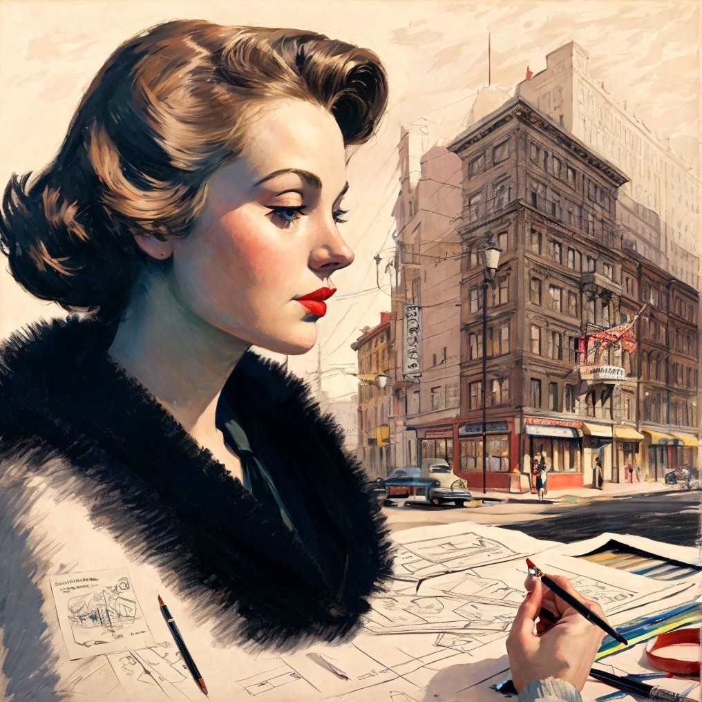 Female artist, circus poster painted by Edward Hopper, of a modern 1938, female artist and designer, Muted full color,