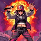 A confident female character stands against a radiant background, wearing headphones and a casual outfit featuring a hoodie and jacket, exuding an energetic and modern vibe.