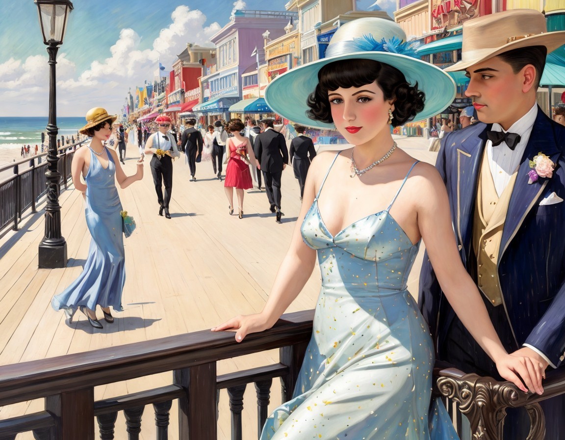 An elegantly dressed couple from an earlier era stands on a busy boardwalk, the woman in a blue dress and the man in a suit and boater hat.