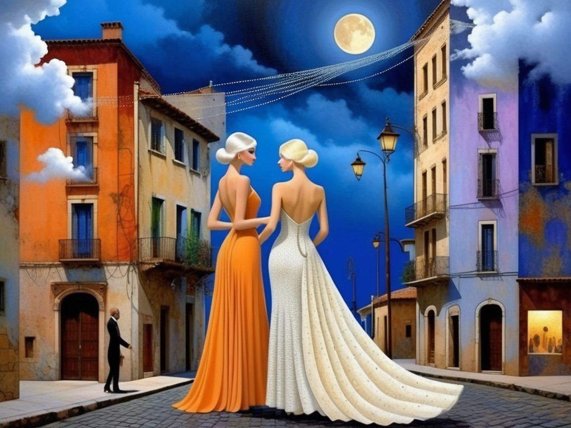 Two elegantly dressed women in vibrant gowns stand in a colorful street, bathed in soft moonlight. A well-dressed man approaches, adding a romantic essence to the enchanting scene.