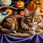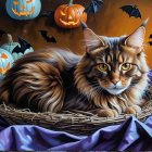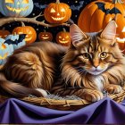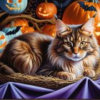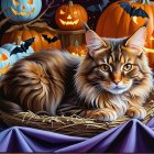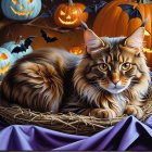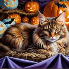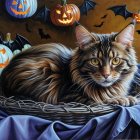 A fluffy brown tabby cat lounges in a basket surrounded by glowing jack-o'-lanterns and bats, creating a cozy, festive Halloween atmosphere. The colors are warm and vibrant.