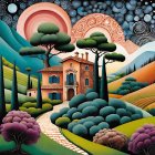 A vibrant, surreal landscape features a colorful house surrounded by whimsical trees and hills. Bold spirals and sun-like orbs in the sky create a dreamlike atmosphere, blending bright hues.