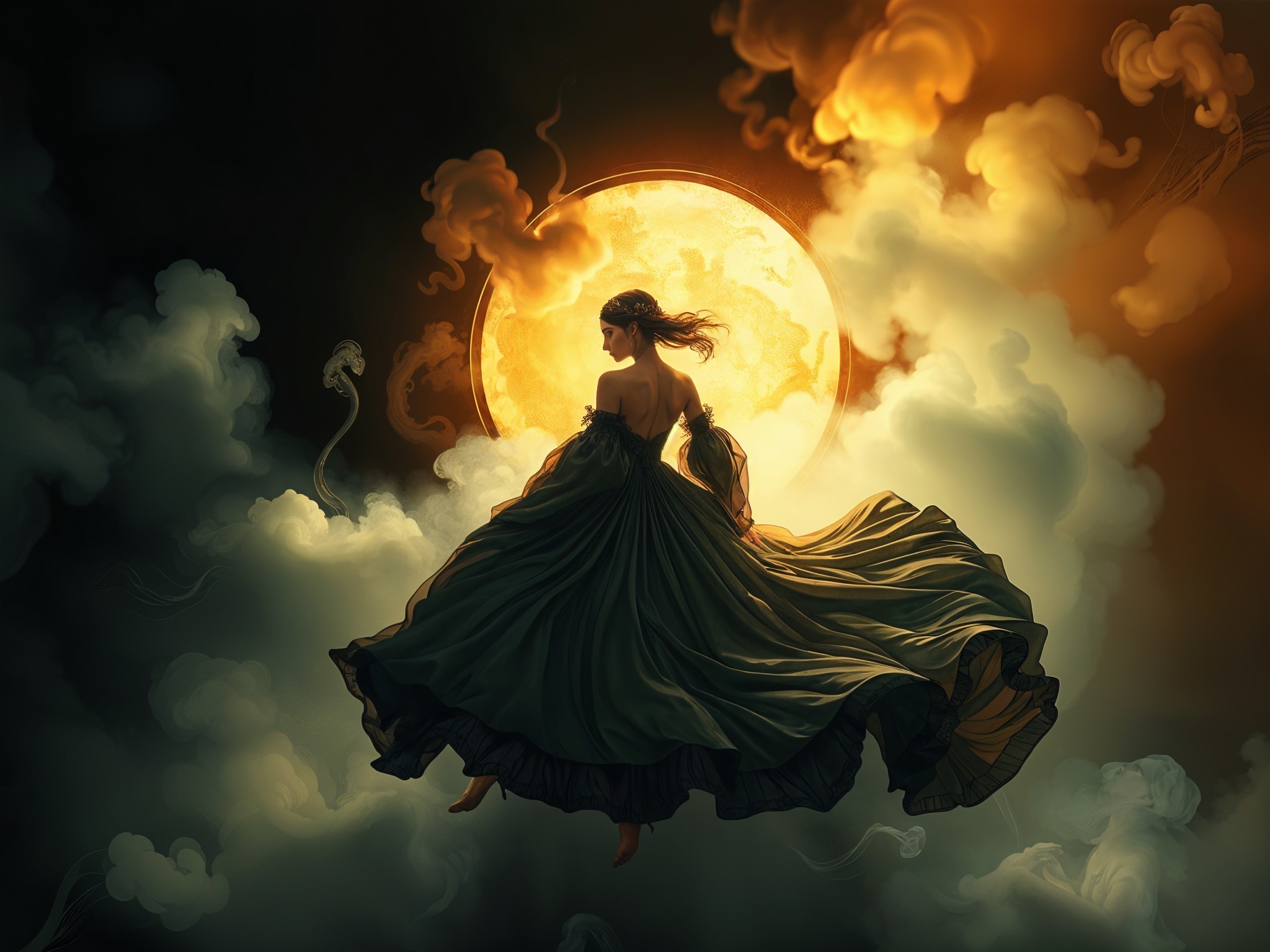 A graceful figure in a flowing black gown stands amidst swirling smoke and glowing light, creating a mystical and dramatic atmosphere that captivates the viewer's imagination.