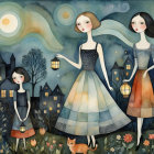 Three whimsical figures stand amid a twilight landscape, holding lanterns. Surrounded by flowers and a playful cat, they wear colorful, flowing dresses under a starry sky with swirling clouds.