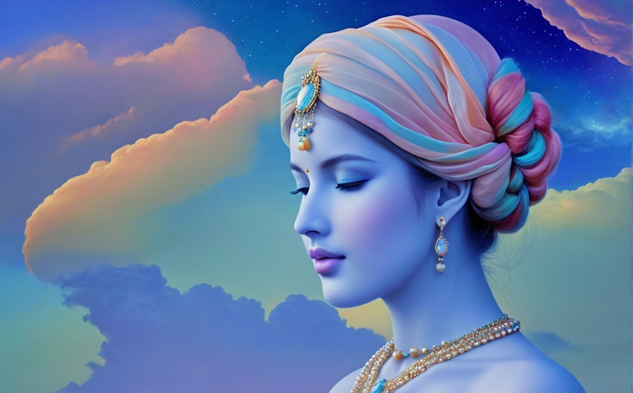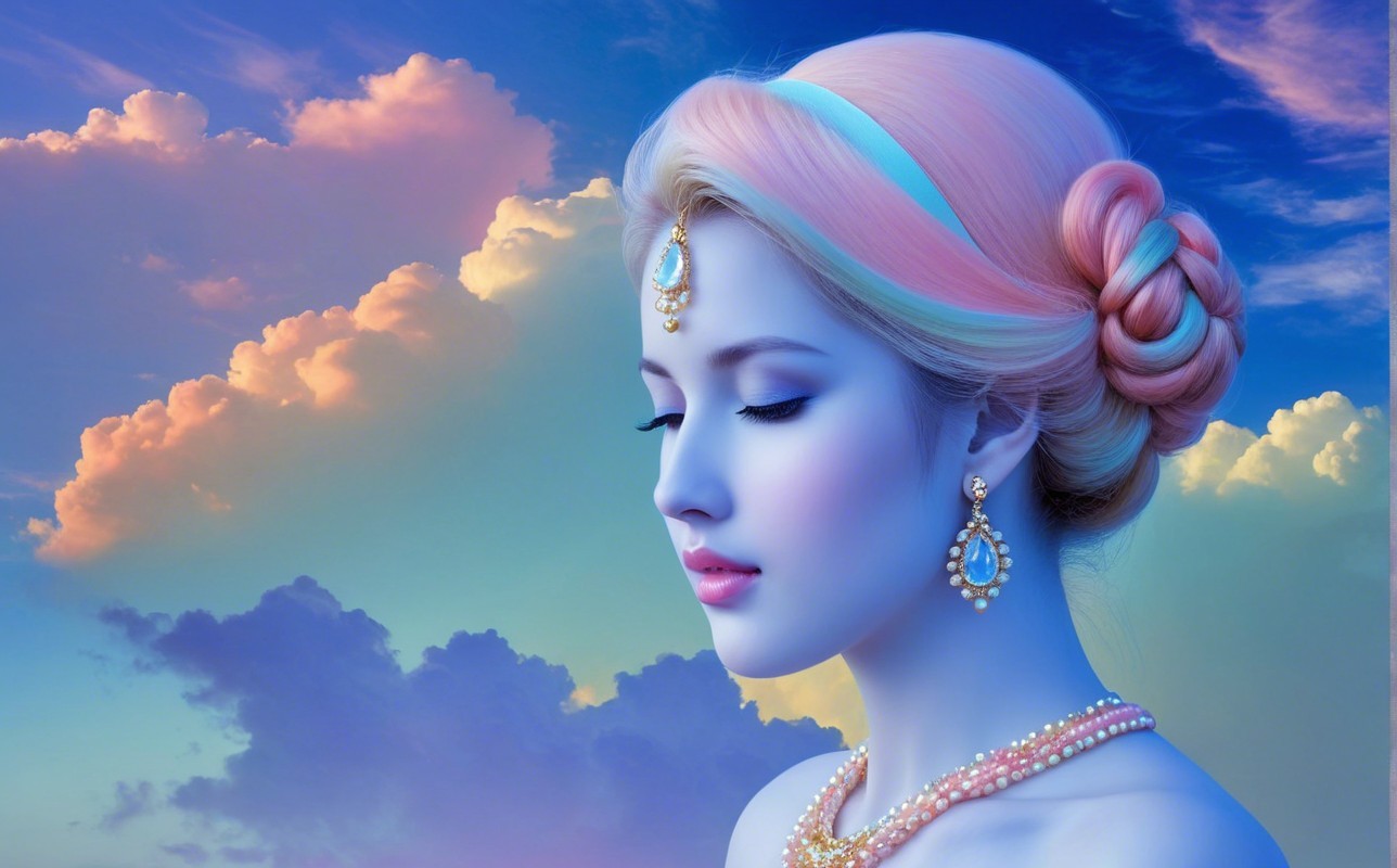 A serene portrait of a woman with pastel pink hair adorned with flowers and pearls. She gazes peacefully against a backdrop of soft, colorful clouds and a twilight sky.