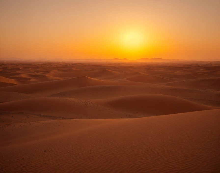 Prompt: "Golden desert landscape, vast sandy dunes, distant horizon, caravan of camels in a row, silhouetted against the setting sun, intricate camel saddles, traditional Bedouin attire, dusty atmosphere, warm earth tones, nomadic lifestyle, tranquil ambiance, realistic digital painting, detailed textures, warm sunlight casting long shadows, inspired by Arabian folklore, high-resolution, Artstation."