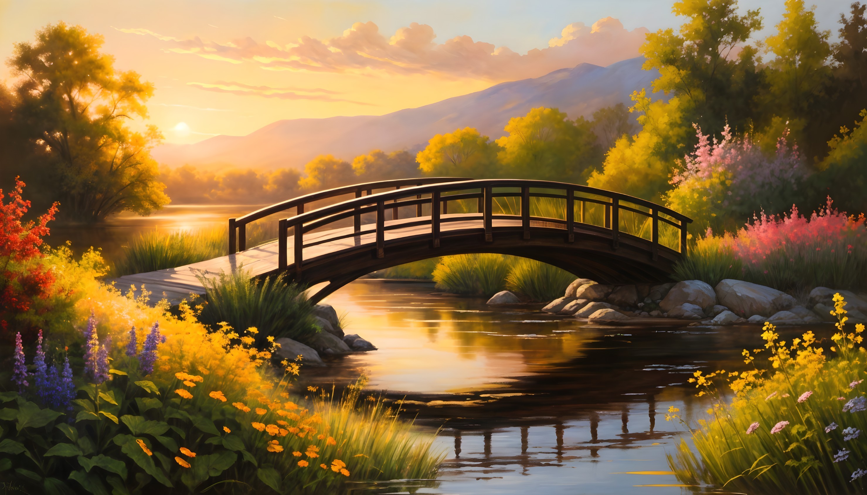 A serene landscape features a wooden bridge over a tranquil river. Vibrant flowers bloom along the banks, reflecting the warm glow of a sunset with mountains in the background and birds flying above.