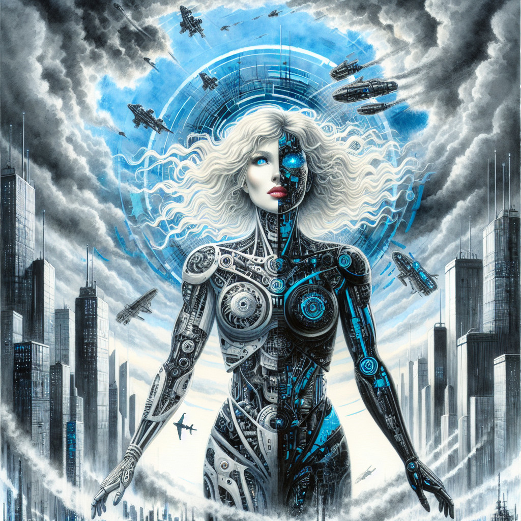 The image features a futuristic woman with robotic elements intertwined in her hair and face, set against a cityscape with flying ships and dramatic clouds, blending technology and beauty.