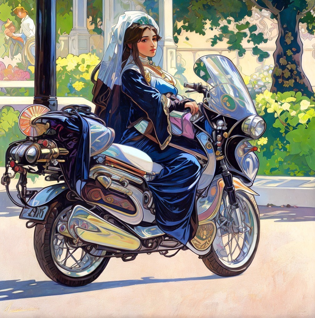 An elegantly dressed woman with intricate attire sits on a motorcycle amidst a blooming garden, with sunlight dappling through the leaves. (Derived from an original photo of a motorcycle cop.)