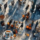 A bustling urban street scene, wet from rain, reflects towering buildings and neon signs. People wander under a gray sky, while one sits at a café, absorbed in the lively atmosphere.