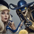 A young woman with long blonde hair wears a knitted hat and futuristic attire, standing beside a stylized steampunk machine with gears and a dark hat, set against a surreal backdrop.