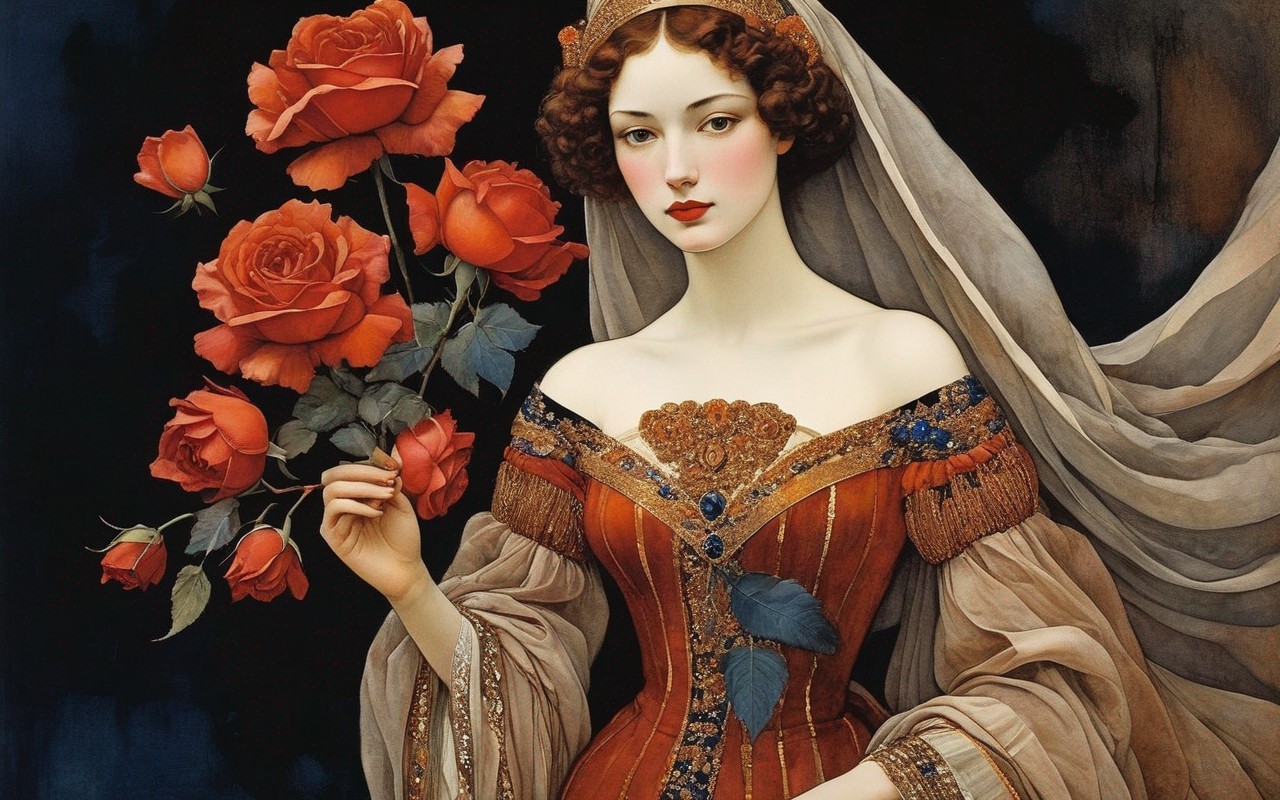 whimsical, beautiful, poignant, touching. colors rose, gold, rust, indigo, burgundy, black. soft watercolor extra water in Art Deco by Annigoni, Egon Schiele, Milo Manara, Botticelli, Catrin Welz-Stein, Jean Metzinger, Klimt, perfect eyes, perfect hands face , highly detailed, complementary colors, hyper detailed. Watercolor and ink splatter, dynamic pose, valentine emotion
