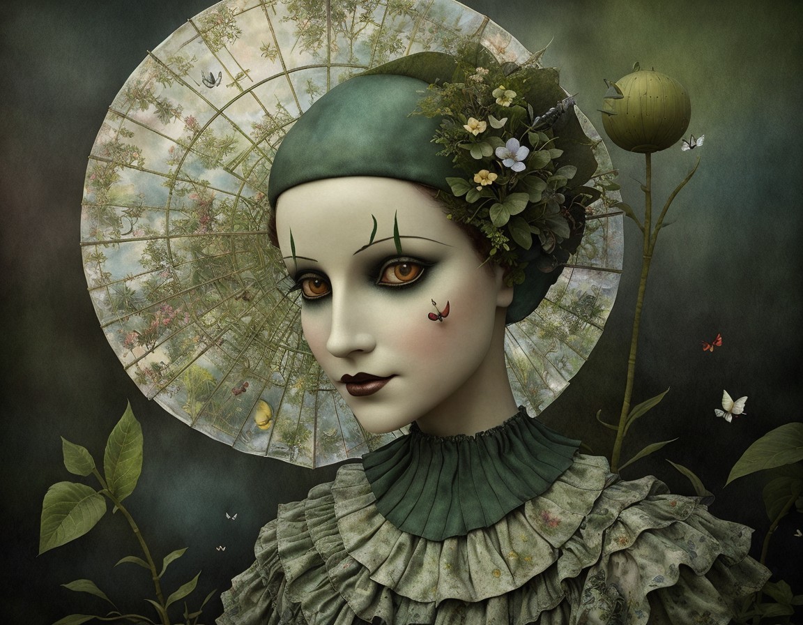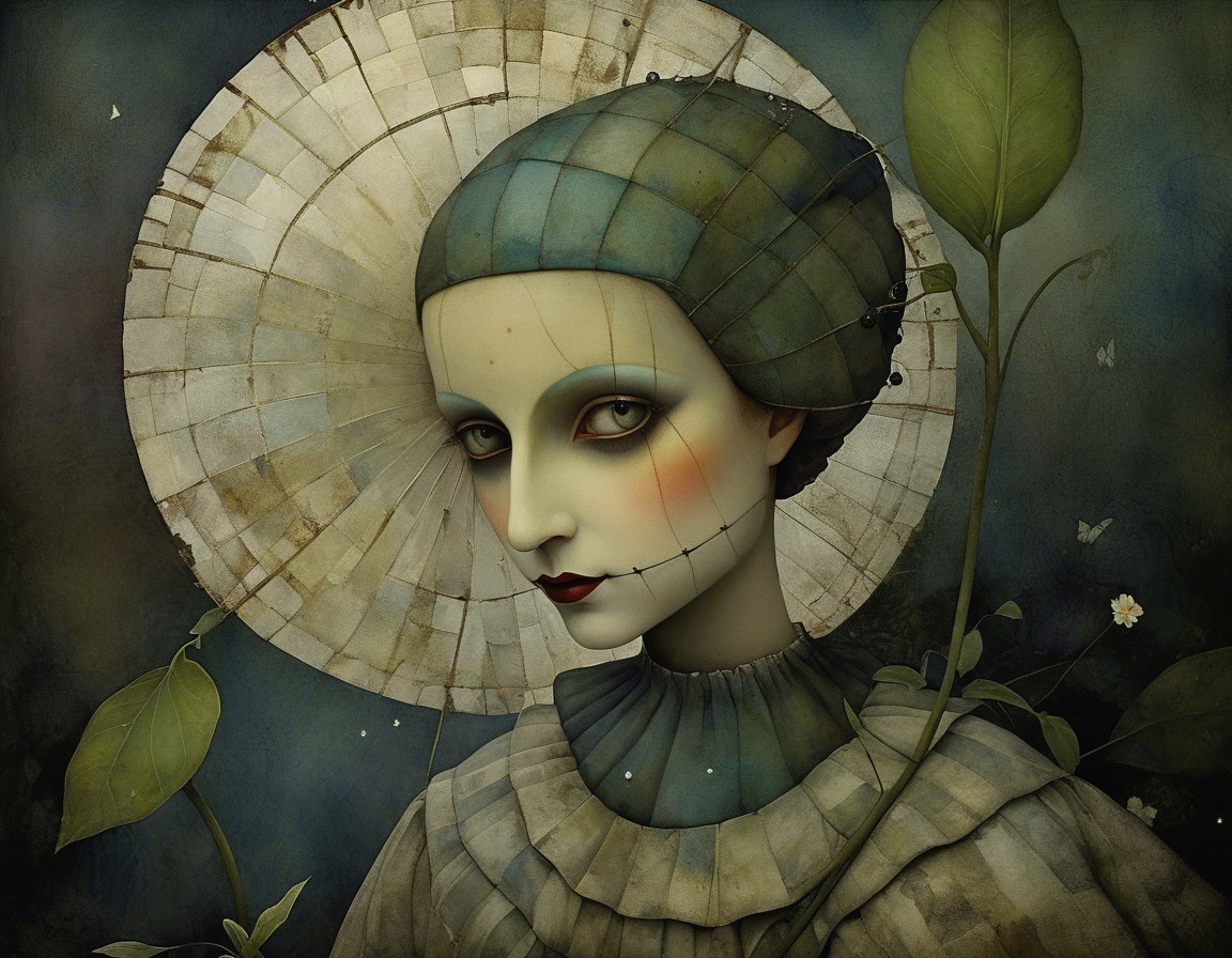 Close up, impish devious beautiful Pierrot creature in a garden maze, in the style of Alexander Jansson. by Catrin Welz-Stein, Michael Parkes