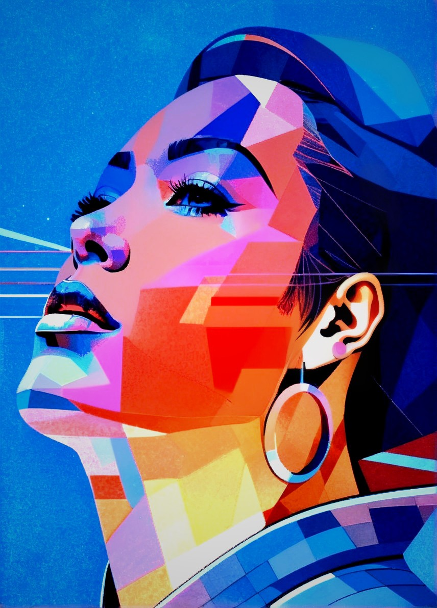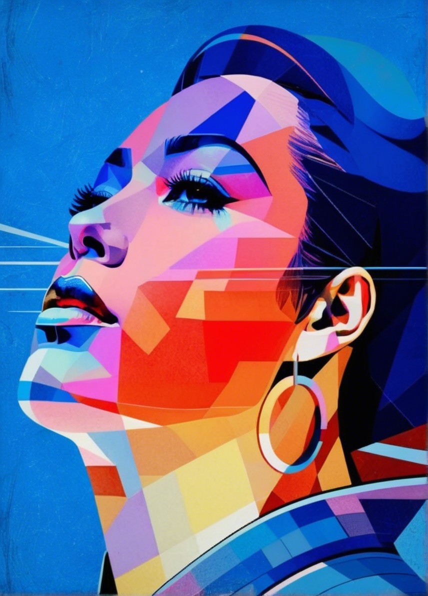 + Prompt:Geometric portrait with linework and line-art fusion, mosaic, several layers of dof, triadic color scheme starfleet-blue dark-red light-black, estranged geometrical iconography, distracted, retro psychedelic grunge and scratchbook art blend, emphasizing shadows and highlights, creating a visually striking composition, collagraphy, great depth and scale, multi-dimenstional, stylized trees with exaggerated features, stylized woodblock print with airbrush overspray, enchanting linework for color flares, beige background, great scales, flares, doodling, gradient inking colors, sfumato-effect, nuanced painterly, transitioning from subtle light to a mesmerizing blend of cerulean blue and soft-gold and silvery-grey, artistic essence by William Adolphe Bouguereau & Ho Baron, hues by Hugo Pratt, lighting by Ho Baron. Bioluminescent, transparence, surreal fantasy. Whimsical abstract scene, soft and muted dark background, textured watercolor, vintage, dark fantasy, tonalism, unparalleled detail, paper fibers, soft eroticism, splash ink technique in style of Marc Allante, colorful yam, warm coloring,dark-grey, slight classicism reminiscence, 5 layers of dof, black brushstrokes adding depth, dyed by Man Ray, line-art, watery textured layers, contoured, tactile feel, simplistic features, intricate fantasy ambiance, detailed vivid coloring and stacked lines, industrial design, sgrafitto reminiscence, parallax occlusion, stacked lines, geometrically structured, smeary, brightness 1.5, visible textures, quaint, fusion of geometrical styles with elements of foampunk, detailed line art, psychedelic ambiance,