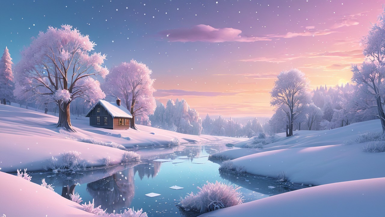 A serene winter landscape featuring a cozy wooden cabin by a gently flowing river, surrounded by snow-covered trees under a pastel sky at dusk. Soft snow blankets the peaceful scene.