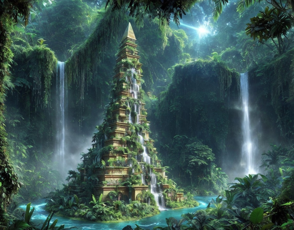 An ancient pagoda surrounded by lush vegetation and multiple cascading waterfalls in a serene, mystical forest setting.