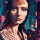 A striking female figure with long dark hair, adorned with a pink tree on her forehead and a matching tattoo. She has vivid green eyes and a futuristic urban backdrop with glowing neon elements.