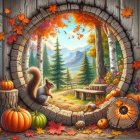 A cute squirrel sits next to a bright orange pumpkin, framed by a wooden log. Vibrant autumn leaves surround it, with a serene path lined by trees in the background.