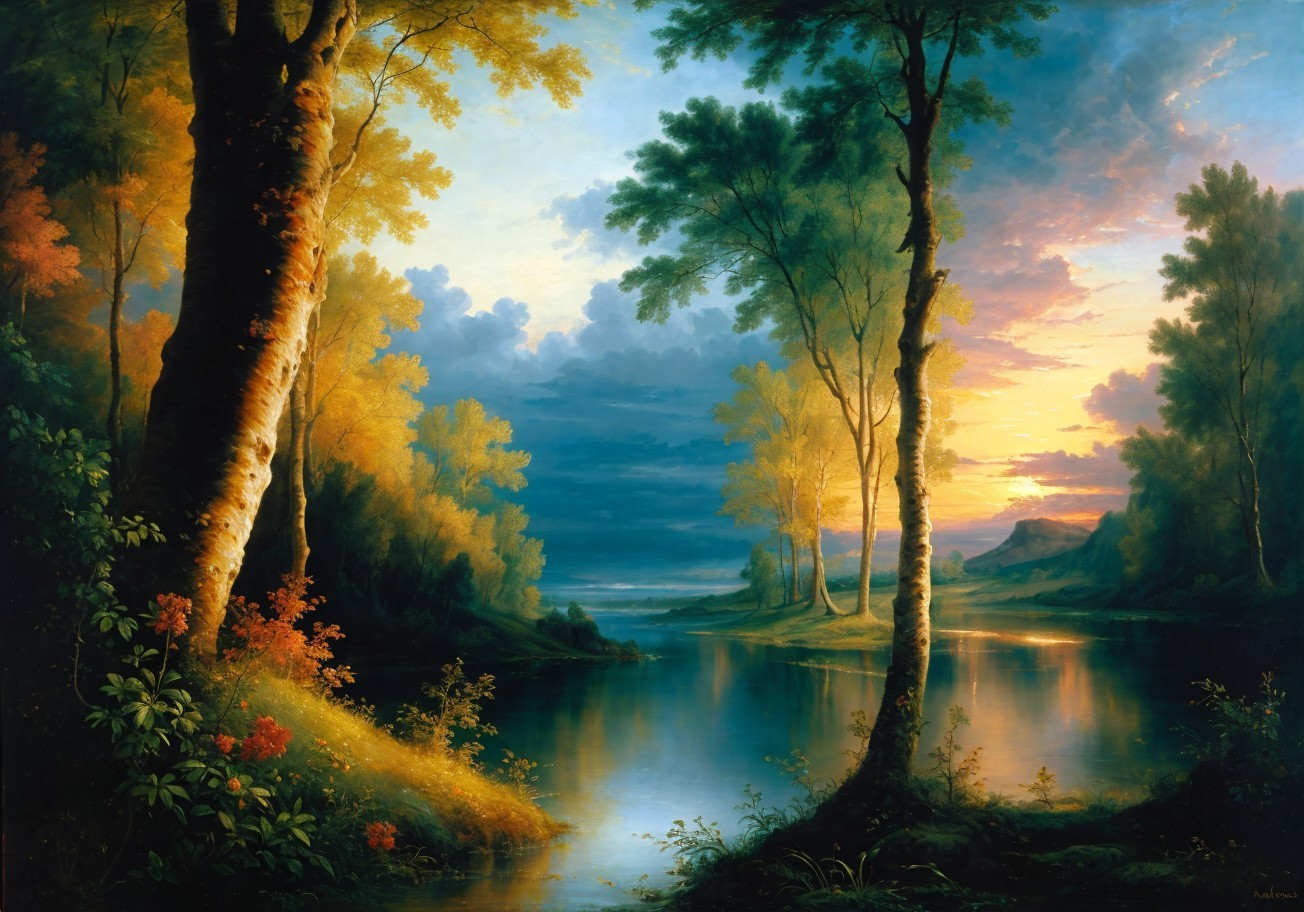 Prompt: "Oil on canvas, wide angle landscape view, a wonderful sunset. Glowing with vibrant hues, glowing with vibrant hues, sky transitioning from warm orange to deep purple. Perfect composition. By Peter Paul Rubens. William Turner. By Pierre-Auguste Cot."