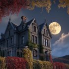 A charming, eerie mansion sits atop a hill under a bright full moon. Surrounded by autumn-colored trees and a spooky graveyard, it exudes a blend of beauty and mystery.