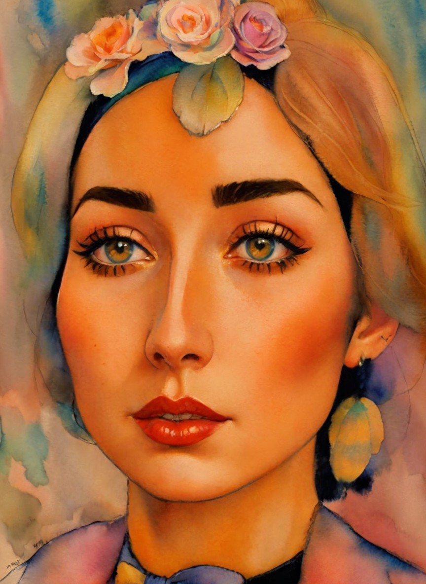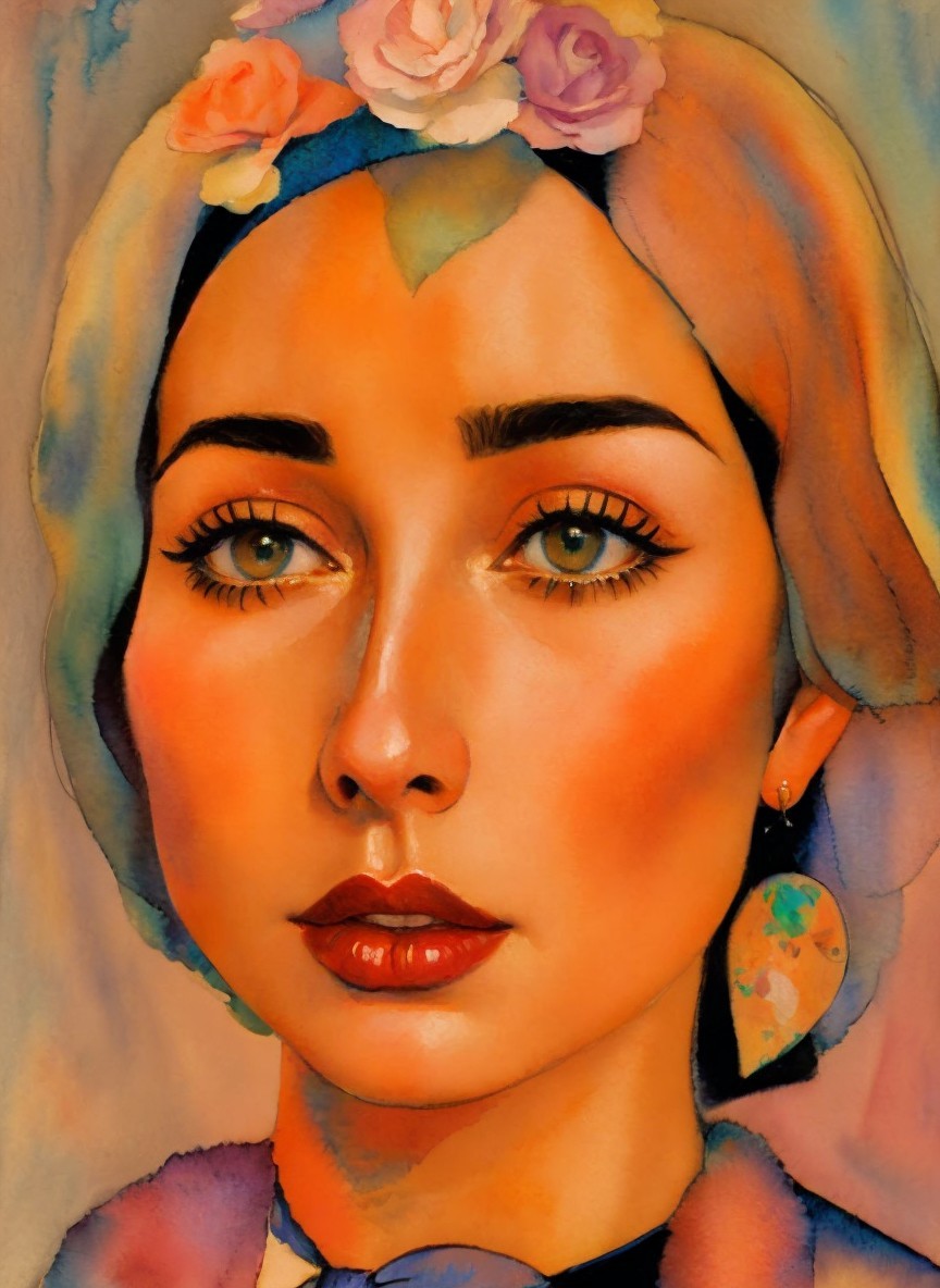 Stylized Portraiture art by Alice Pike Barney, Alexej von Jawlensky, Amanda Blake, Anna dittmann, Ann Mortimer; Arlie Opal, Overton Loyd, Margaret Keane and Marsden Hartley, rockette with staring eyes, auburn hairdo with streaks, 3D texture brushlines; soft quilling; stylized illustration 1.8, watercolor and ink, beautiful composition 1.9, 3d effects 1.8, chiaroscuro lighting in background, alcoholic inkpunk 1.8, plushy, sweaty, occult, retropunk, creamy, soft edges, blur, grain, muted colors 0.8,, auracore 1.7, American gothic 1.7, triadic color scheme pink blue black, anisotropic filtering 1.7, 3d effects 1.8, shadow mapping 1.3, wavery texture patchwork, cottagegore 1.7, octane render illustration, hues, plasticity, stylized illustration 1.5, brightness 1.9, dry brushed paint, gouache paint 1.8, smooth edges, Streamline_Moderne,