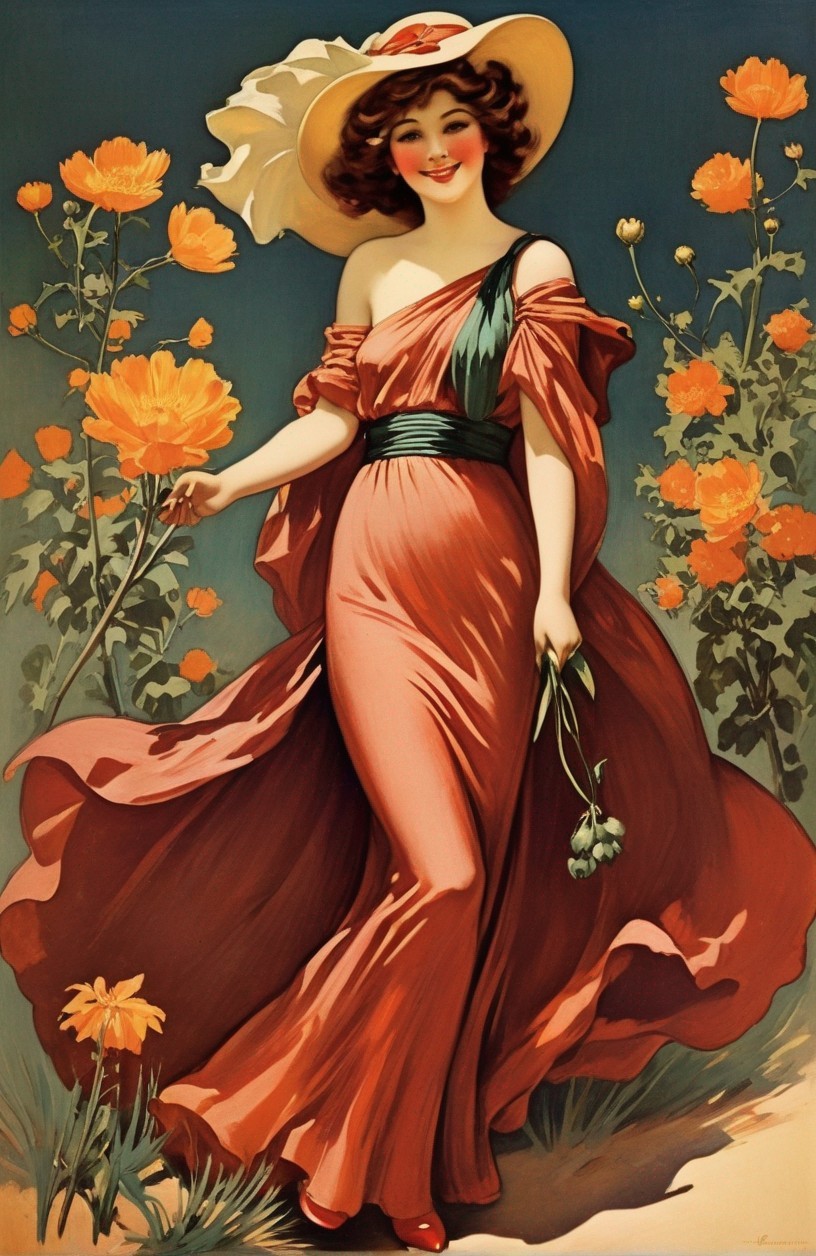 + Prompt:by Leonetto Cappiello, She blooms like a garden fair, In her smile, the sun’s warm glare. A blossom in the desert wild, In her touch, nature’s child
