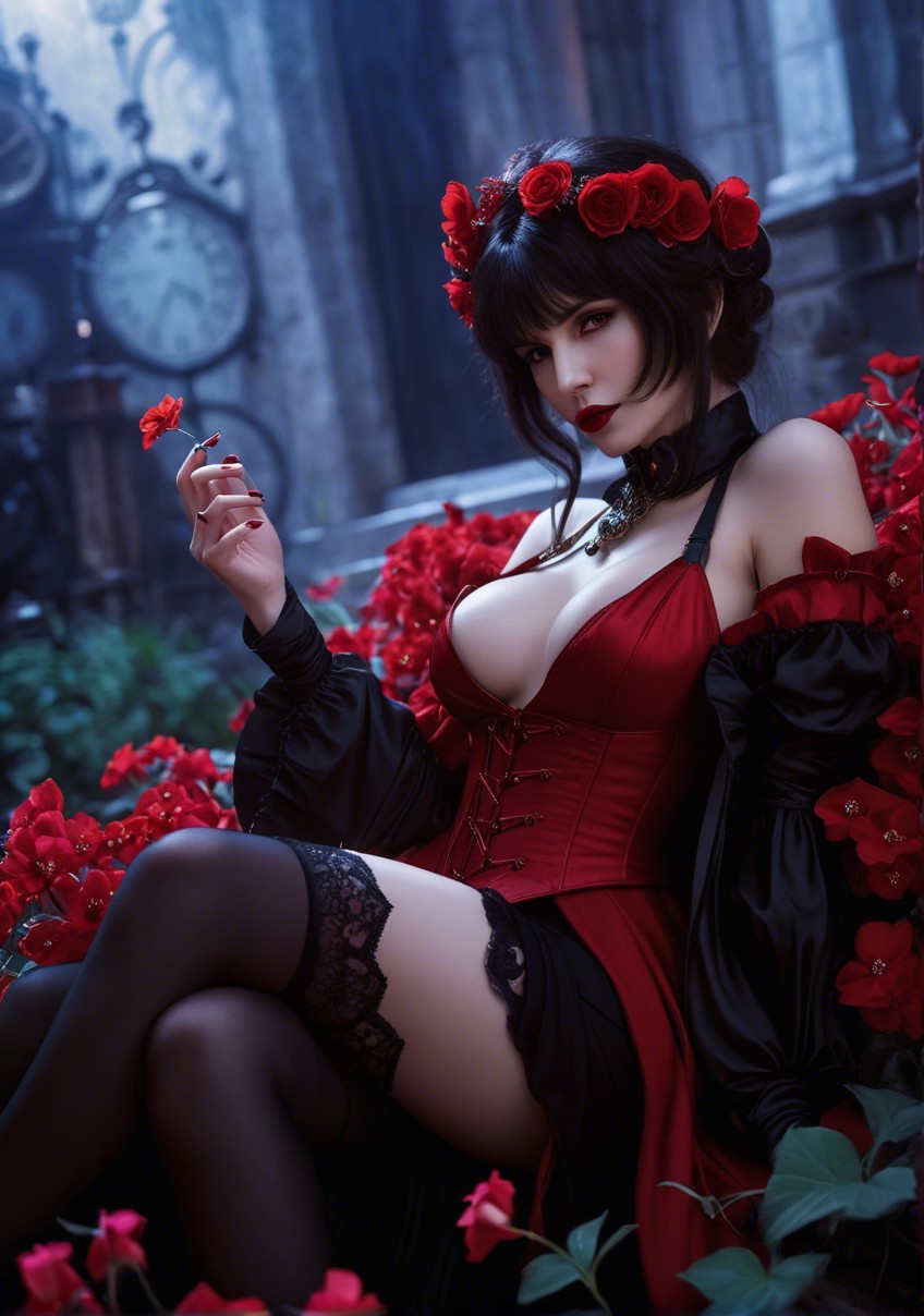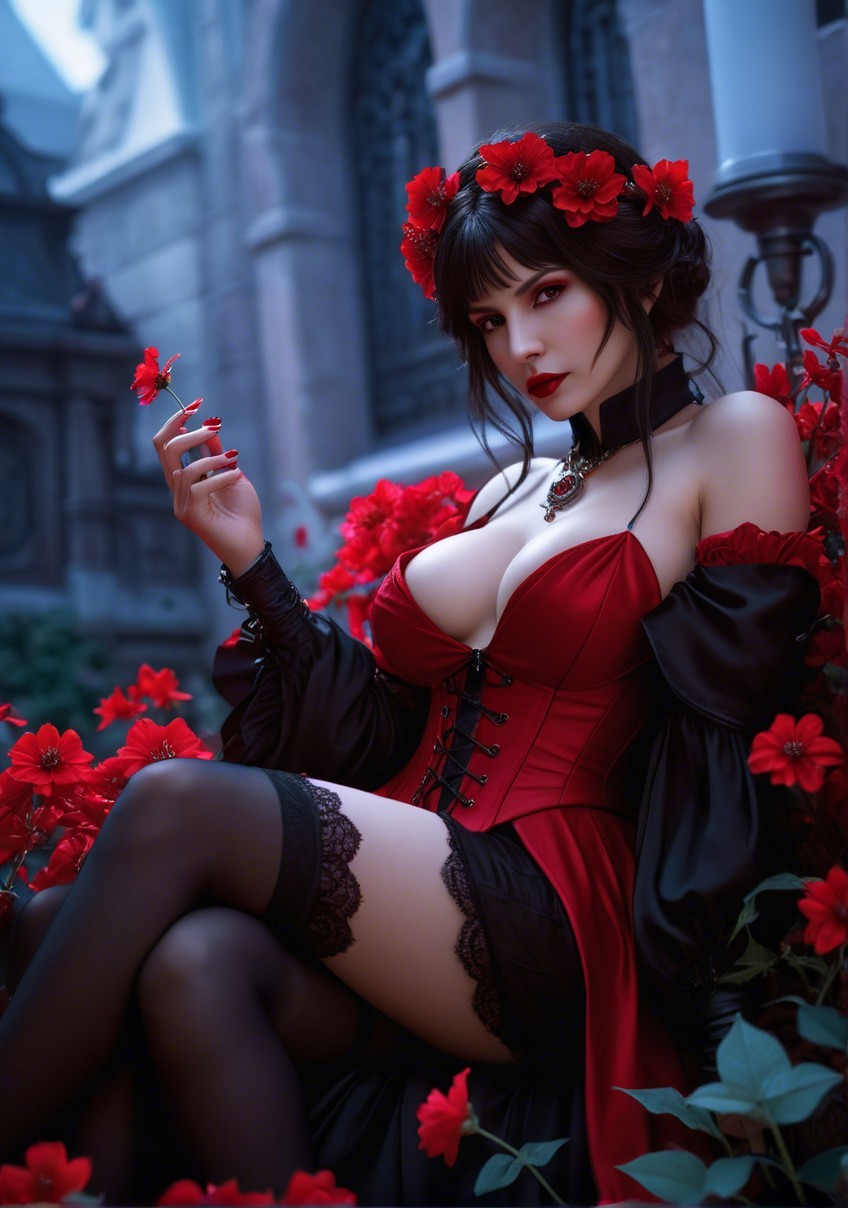 A striking figure dressed in a red corset and dark gown sits amidst a sea of red flowers. She has a floral crown and an alluring expression, with a moonlit backdrop enhancing the atmosphere.