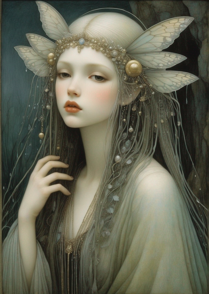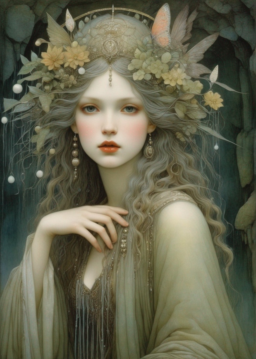 Ethereal figure with pale skin, white hair, floral headpiece, blue & gold gown