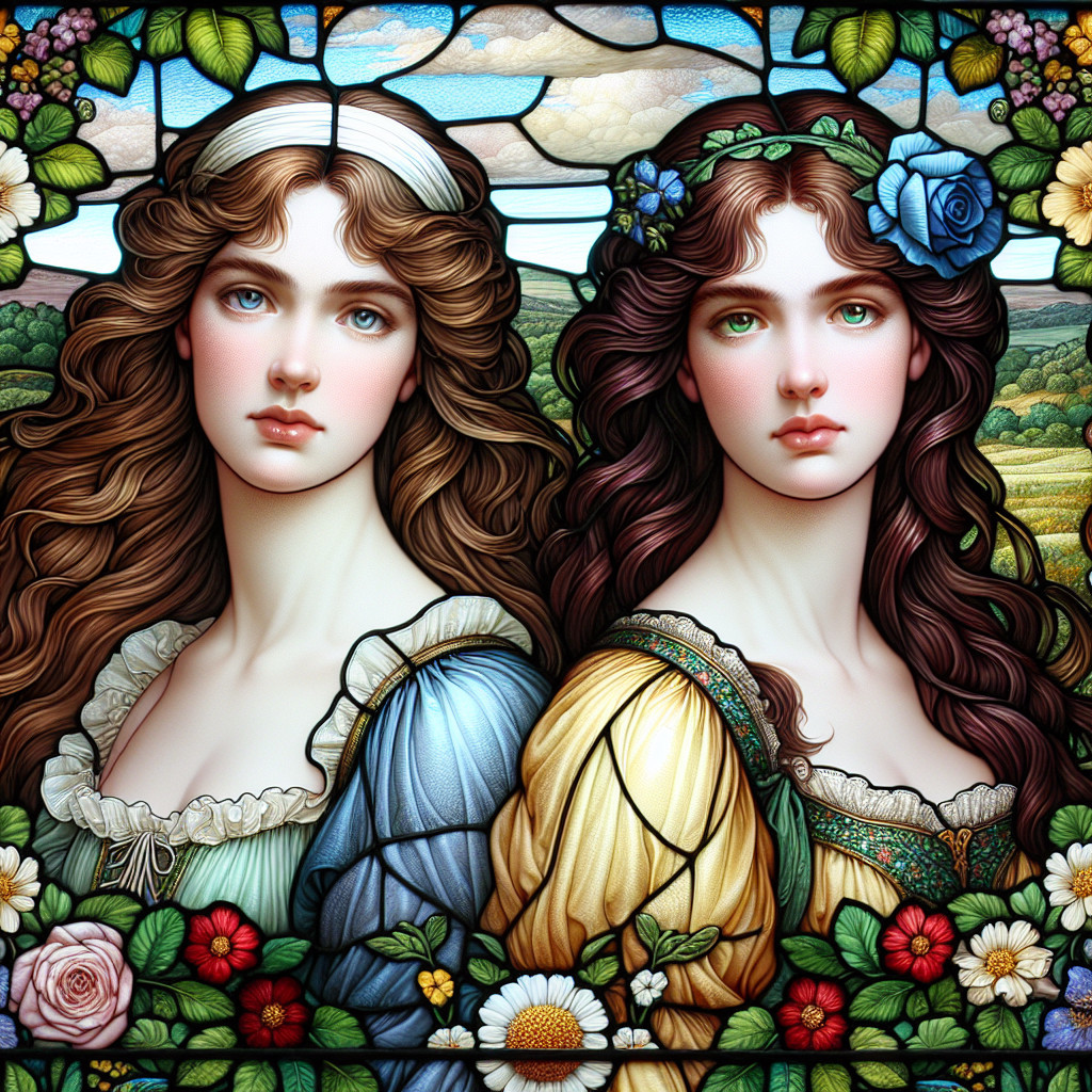 The image features two exquisite women beautifully depicted in stained glass style, with flowing hair adorned with flowers, set against a serene landscape of rolling hills and a colorful sky.