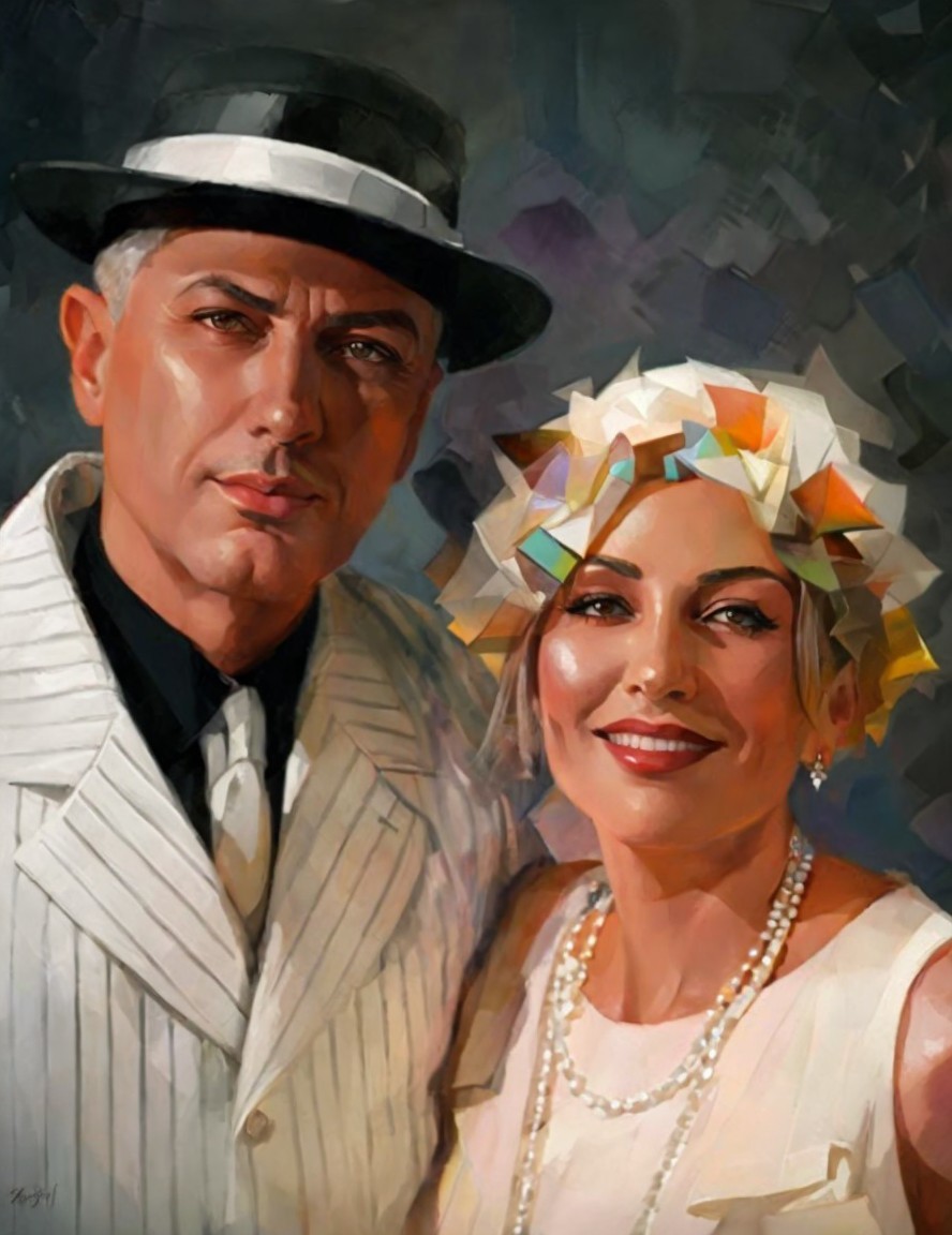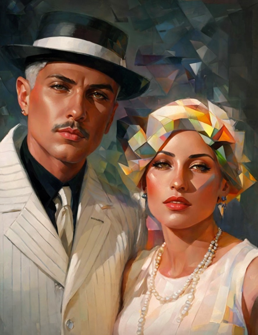 Stylish man and woman in hat and headscarf against abstract cityscape