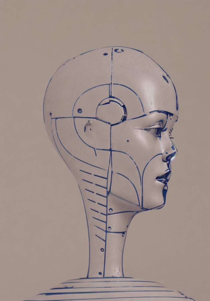 A metallic robot head with human-like features and detailed panel lines on a beige background.