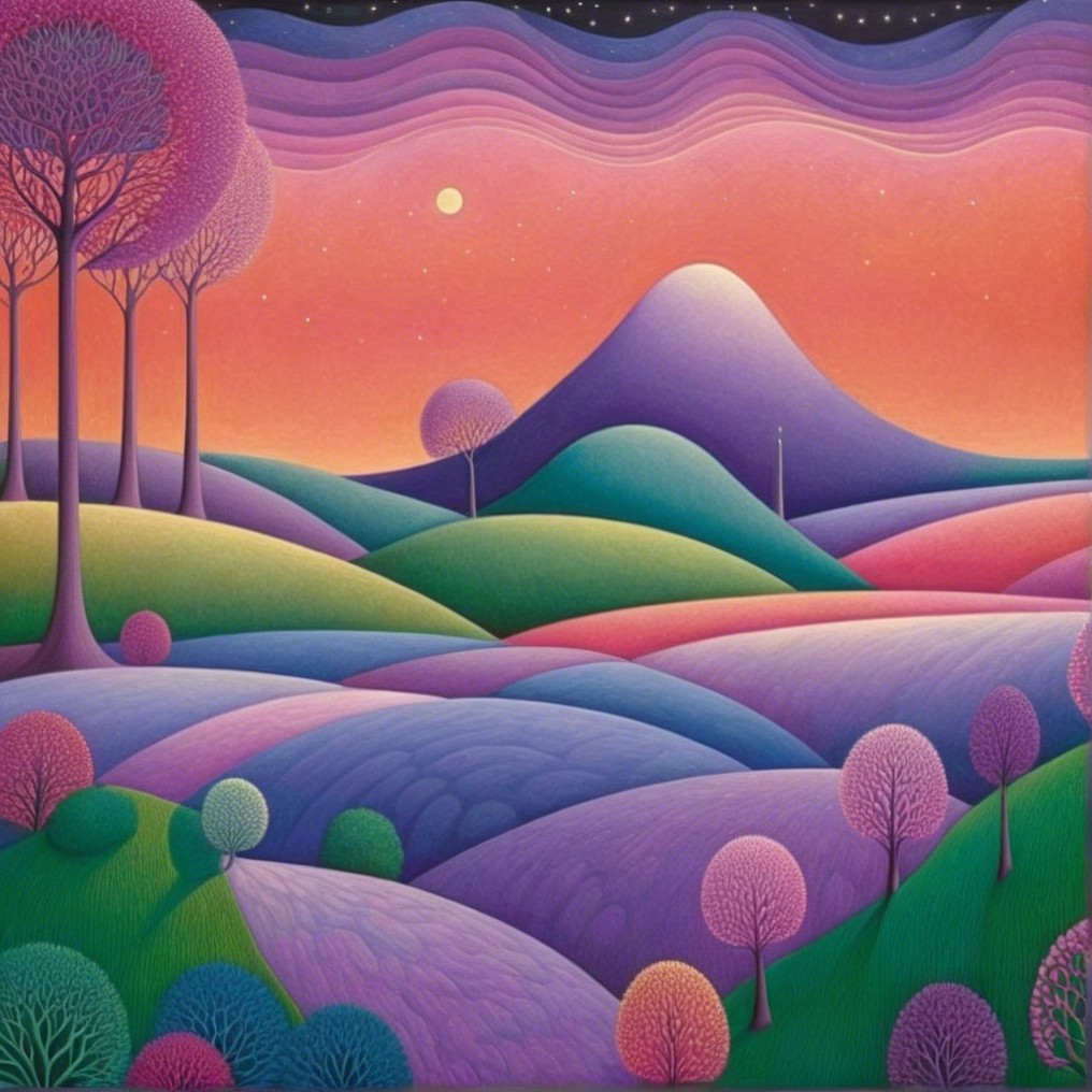 A surreal landscape features vibrant, swirling colors, with rolling hills, whimsical architecture, and a majestic mountain under a cosmic sky illuminated by two suns, evoking a dreamlike atmosphere.
