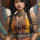 cute dark skinned native Hmong girl, Japanese subculture Dolly Kei, abstract colors and patterns, optical illusions, MC Escher, long flowy random pattern and colored dress, short crop top, she has tribal tattoos, brown eyes, very big chest, she wears a stylish 1950's Charlie Chaplin hat, very thick plump thighs, piercing, very thick plump wide hips, bottom heavy, thick plump juicy legs, curvy thick, extra plump juicy large thick red gothic lips, wavy curly long pink hair, wearing tattered, flowing attire, with intricate dark lace and gold adornments. flowers, long pantyhose, fishnet stockings, choker, collar, sorrow filled face, romantic, The style is reminiscent of Frank Miller's Sin City, with high contrast black and white, stark silhouettes, and a raw, graphic novel feel
