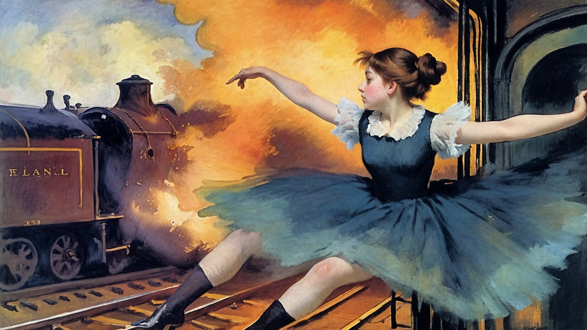 A young ballerina in a ruffled navy dress stands on a train track, gazing back at a vintage steam train billowing orange smoke, creating a surreal and dramatic scene.