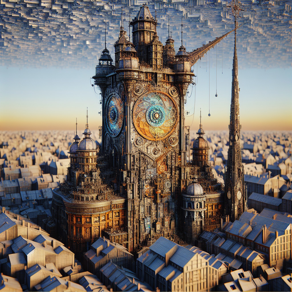 The image showcases a stunning clock tower, featuring ornate architecture and large clock faces, surrounded by rooftops and a picturesque cityscape bathed in warm light.