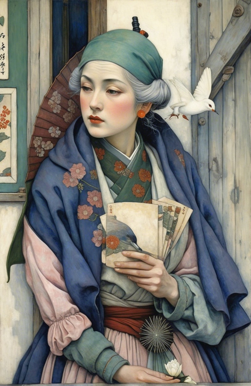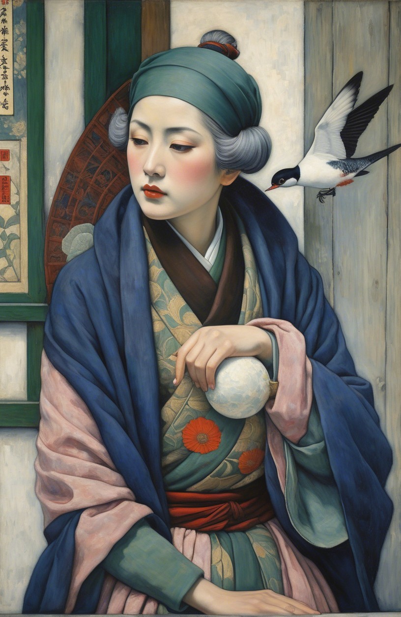 A serene young woman in traditional attire, adorned with a red obi, gazes thoughtfully with delicate features. The background features elegant floral patterns and an artwork of a similar figure.