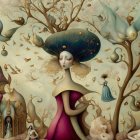 The image features an ethereal scene with a woman in a deep purple dress, surrounded by intricate, swirling trees. Golden ornaments and serene figures add to the mystical atmosphere, evoking a sense of tranquility.
