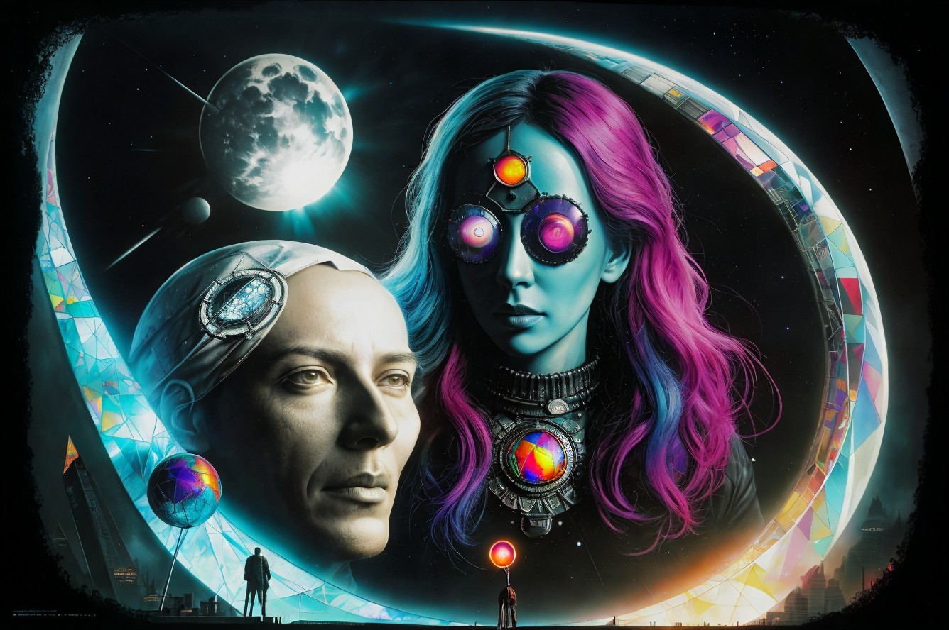 + Prompt:Modern city , metal monument. Black hole in the sky, bridges to the city, psychedelic cloud colors, Comics style mixed with dystopian miniature work. Mixed media By Beksinski and Bill Sienkiewicz. Colorful palette