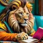 A majestic lion reads a story to a playful cub in a cozy, richly decorated room, surrounded by flowers and ornate vases, evoking a warm and tender atmosphere.