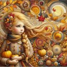 A whimsical autumn scene features a mother and daughter seated beneath a tree adorned with orange leaves. They are surrounded by kittens and pumpkins, with a golden moon in the background.