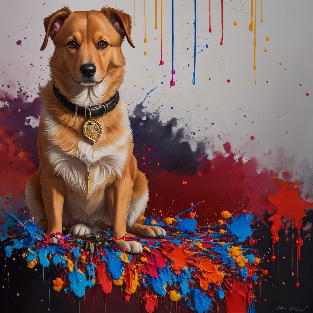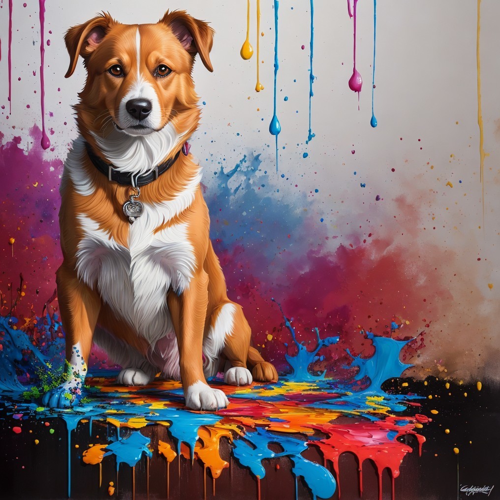 Dog in image, Speedpaint with large brush strokes by Stanley Artgerm, Robert Oxley, Justin Conway, Gazelli, Tyler Edin, Jacek Yerka, paint splatter, paint drips, drip painting, a masterpiece, 8K resolution, trending on ArtStation, maximalist, uncanny, highly detailed, intricate
