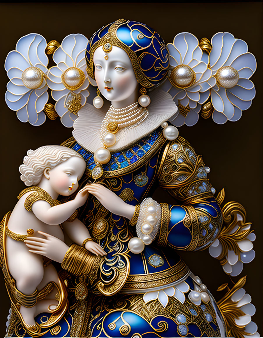 Prompt: Finely engraved ivory and delightfully painted guilloche enamel depicting a woman with a child, 3D optical illusion, pearl, silver, blues and gold, a beautiful face of unique beauty, a work of great craftsmanship and historical value, art in the style of Carl Faberge and Marius Cornelius Escher(((Anatomically correct hands and fingers, and legs of the baby)))