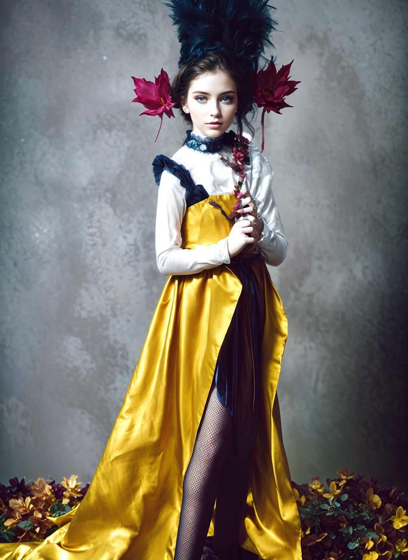 (Old Bud Good) A young girl stands gracefully in a striking yellow gown, adorned with black and blue feathers. She holds a decorative feathered accessory, surrounded by colorful flowers.