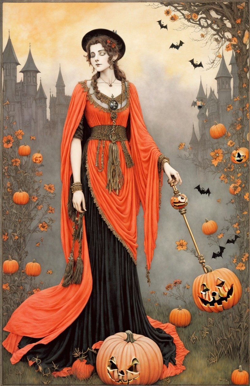 A skeletal figure in a witch's outfit stands in a spooky landscape, surrounded by carved pumpkins and bats, with a full moon illuminating a haunted house in the background.