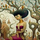 A mystical scene featuring elegantly adorned women amidst swirling trees and whimsical patterns. Rich colors and intricate designs create an enchanting atmosphere of beauty and harmony.