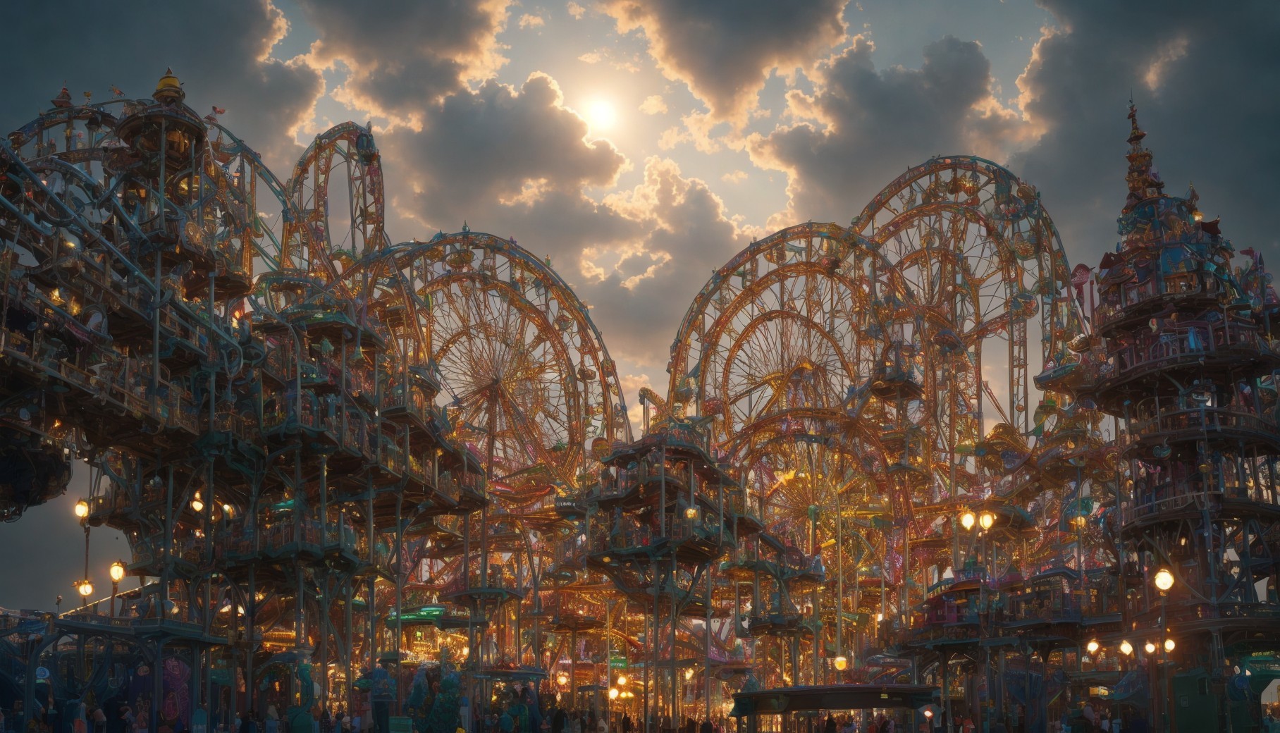 Amusement park with twin ferris wheels and ornate carousels at sunset