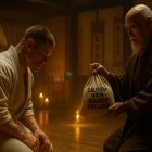Setting: Ancient, traditional dojo interior — wooden floors, paper sliding doors, warm candlelight flickering all around. Shadows cast on the walls — old training scrolls and a rack of hand-stitched sacks in the background. Main Focus: Young Teen John Cena (maybe 15–16) in a simple training gi, bowing deeply before his elderly Sensei — the Sensei is calm, wise, dressed in an old robe. Close-up detail: Sensei holds out the very first CAUTION: HIGH BOUNCE PAYLOAD sack, rugged, hand-stitched, almost sacred. Mood & Style: Warm, nostalgic film — feels like an old memory. Cinematic depth: soft focus on the candles, sharp on the moment. Sensei says “Your trajectory must never break.”